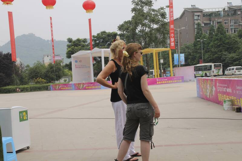 Een onderonsje vlak voor aanvang Ook in Wuzhen spelen we 4 voorstellingen. Het is bouwen, spelen, breken en een dag later door naar Beijing